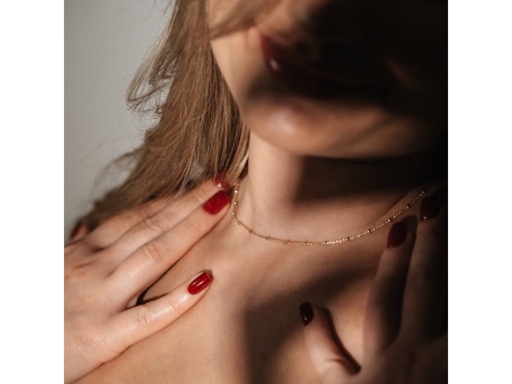 Délka 40 cm jemně obejme krk, ale není těsná. Řetízek pěkně kopíruje linii krku a vypadá skvěle jak u kulatého, tak u véčkového výstřihu. Ideální volba, pokud chceš, aby měla šperk pořád na očích i na srdci.