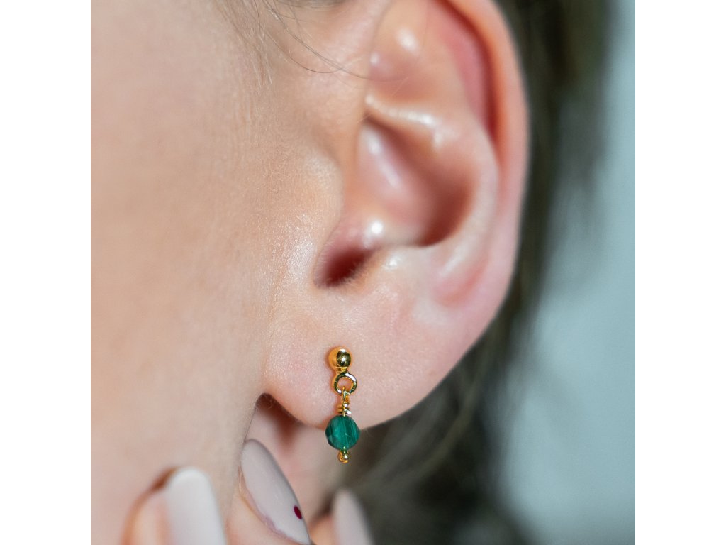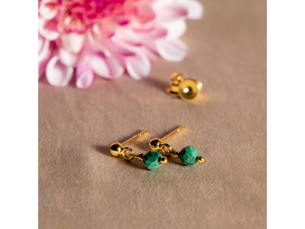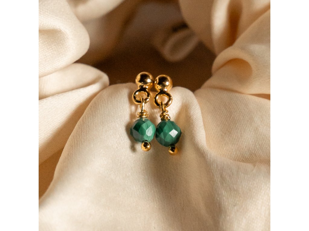 Náušnice s minerálem pro znamení Štíra. Malachit přináší pocit lásky a harmonie, uvolňuje zábrany a učí nás projevit city. Také zvyšuje intuici a tím pomáhá proniknout do jádra problémů a přebrat zodpovědnost za své činy i myšlení.